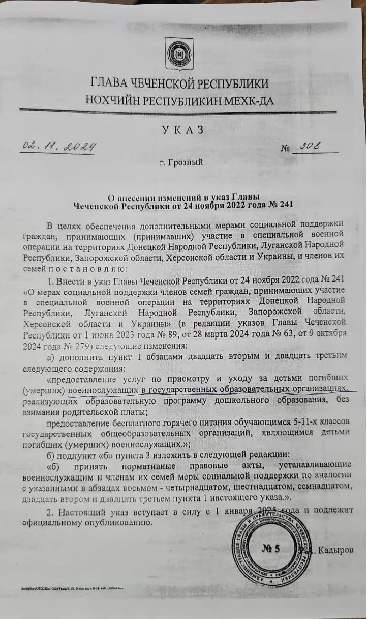 Указ №308 от 02.11.2024г. О внесении изменений в указ Главы Чеченской Республики от 24 ноября 2022 года №241